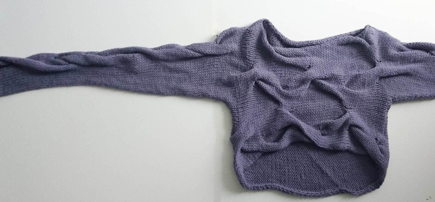 The sweater is worked from side to side, starting with right sleeve. The sleeve is worked in rounds simultaneously repeating the cable pattern with the middle stitches and increasing at the beginning and end of round. When reaching the armpit, stitches for the back are cast on at the end of the last round. The work is turned and purled flat to the stitches cast on at the end of last round and they are purled through the back loop to form the stitches for the front. A couple rows are worked flat for shoulder. Then sts are divided in two, half become the back and the other half become the front. The front is worked first with chest cables while the back sts are left on hold. Once both back and front are knitted, they join to become the left shoulder and later the left sleeve, which is worked in the round with cable in the middle and decreases on both sides.