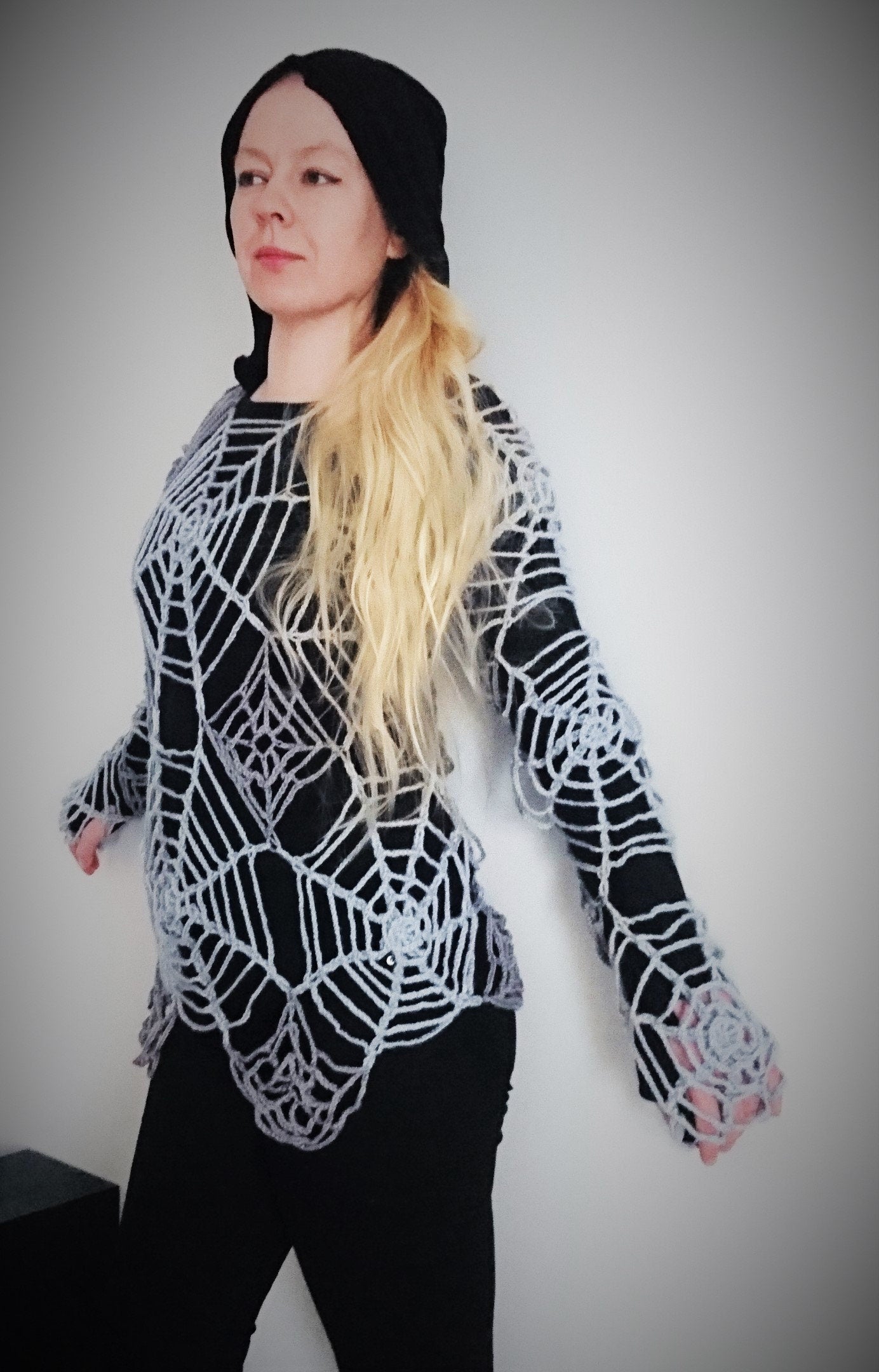 The dress is crocheted out of octagons (the cobwebs) and squares (the smaller spider webs). All the octagons are crocheted first and blocked. Then they are put together with the squares on the last round of the smaller motifs. No seaming or crazy amount of loose ends to weave in.