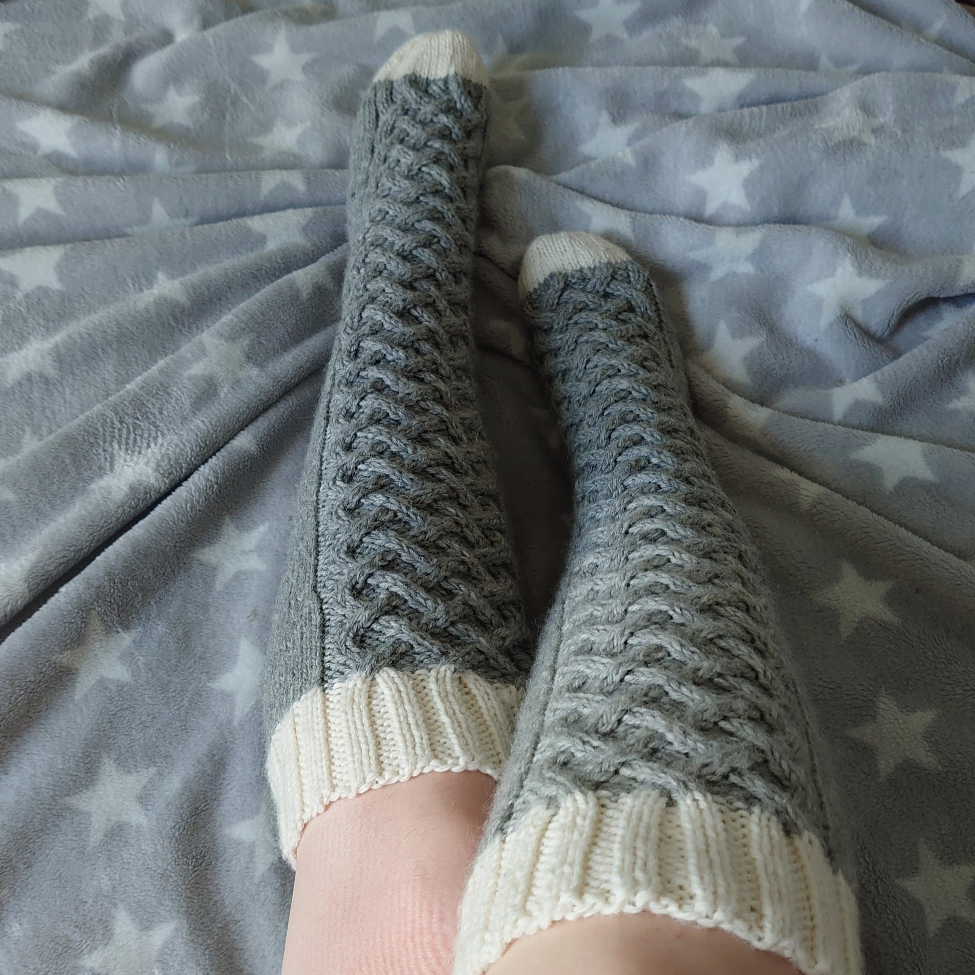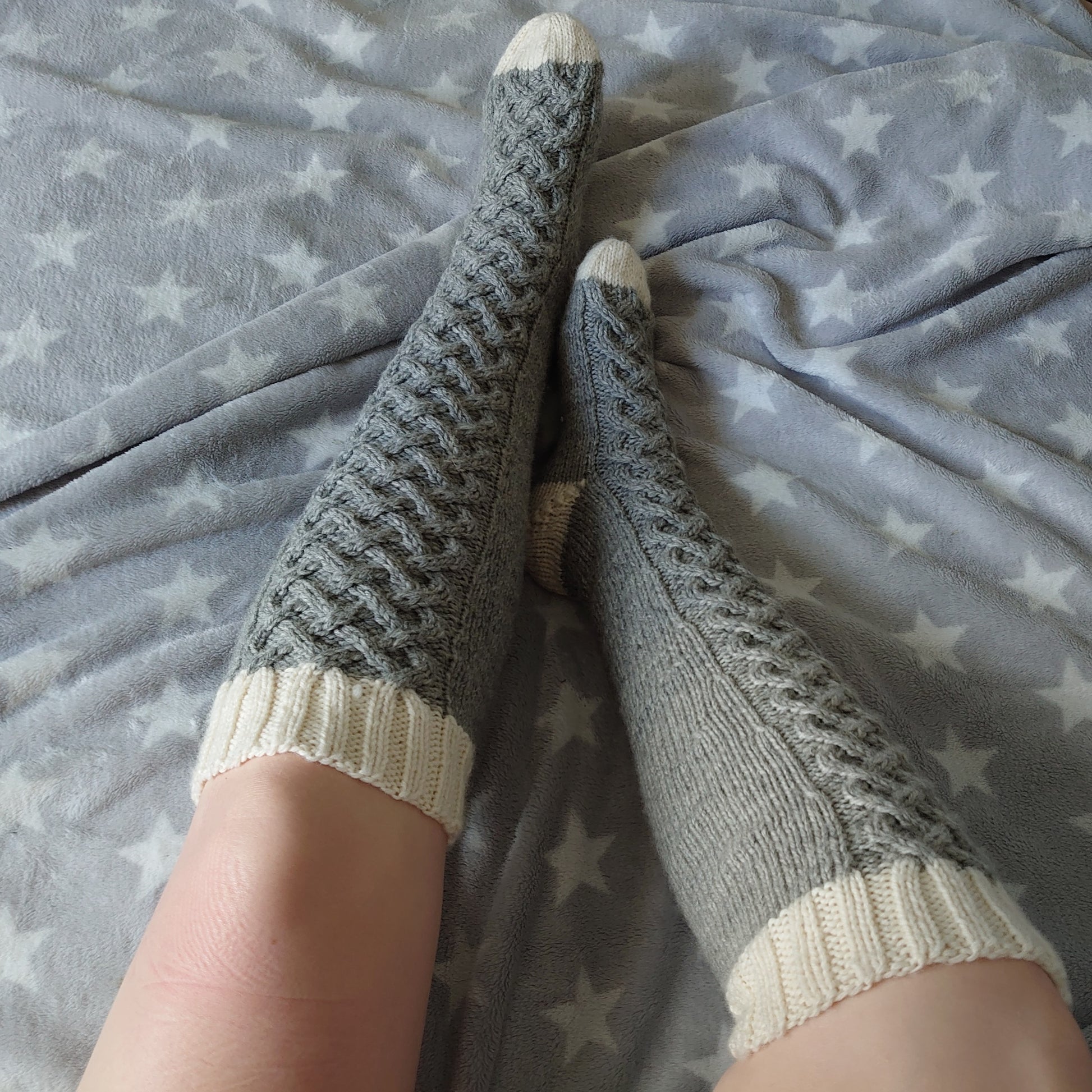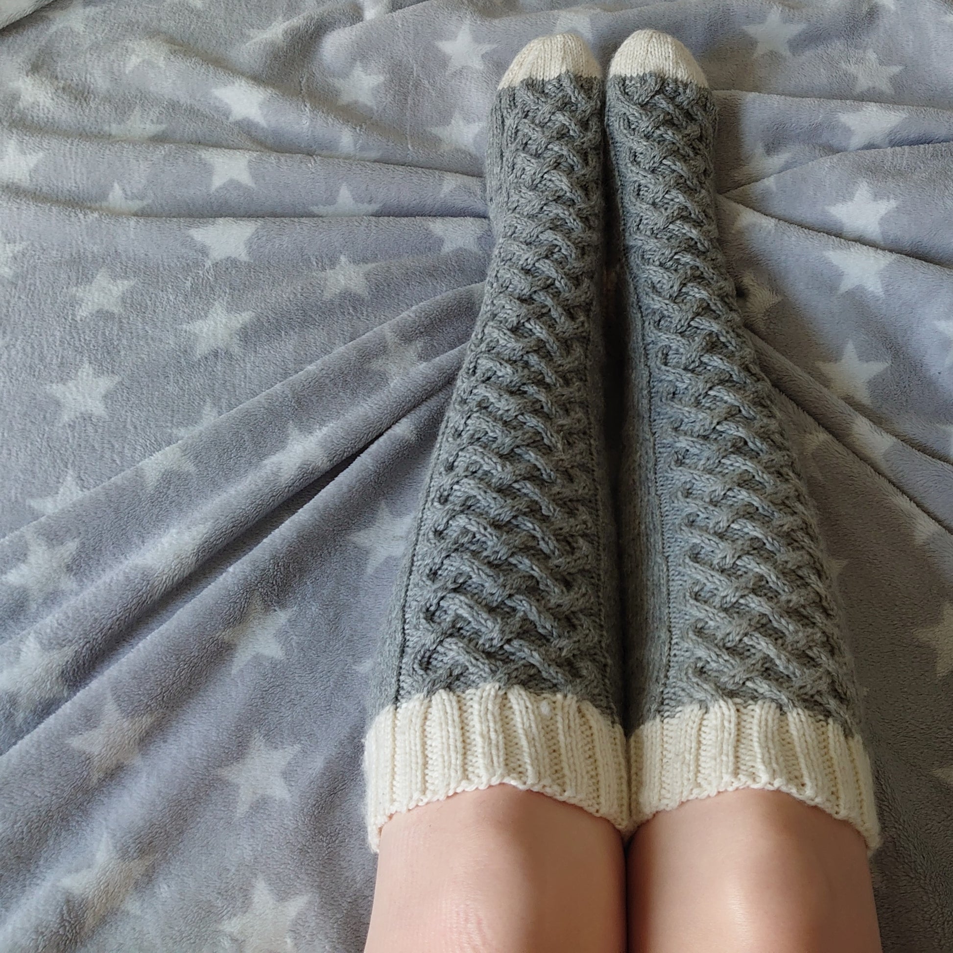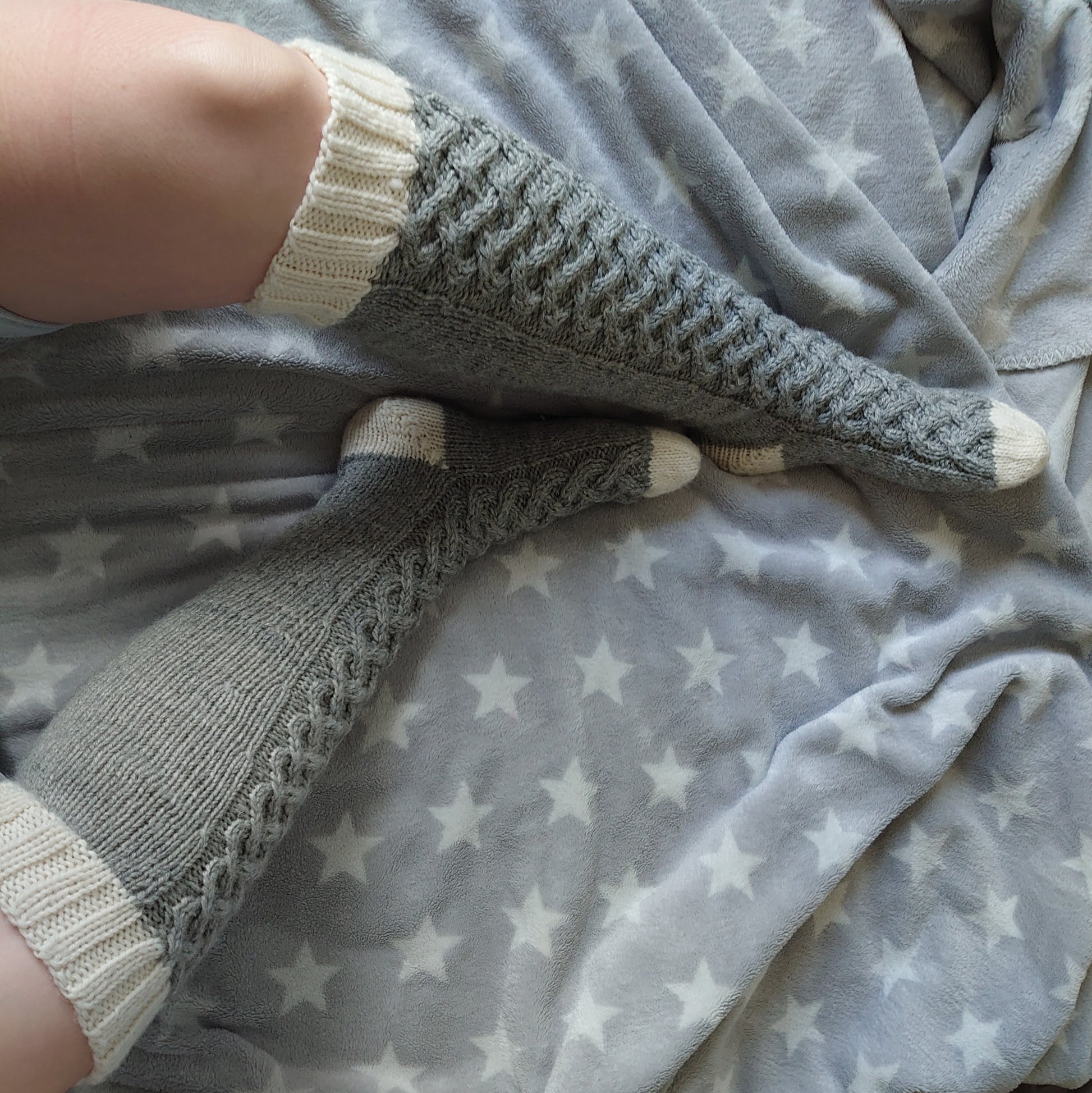 Scandinavian, knee high stockings, bulky cable knitted house slippers/ bed socks. Worked cuff down, these are very fast and easy, beginner friendly knitting project!