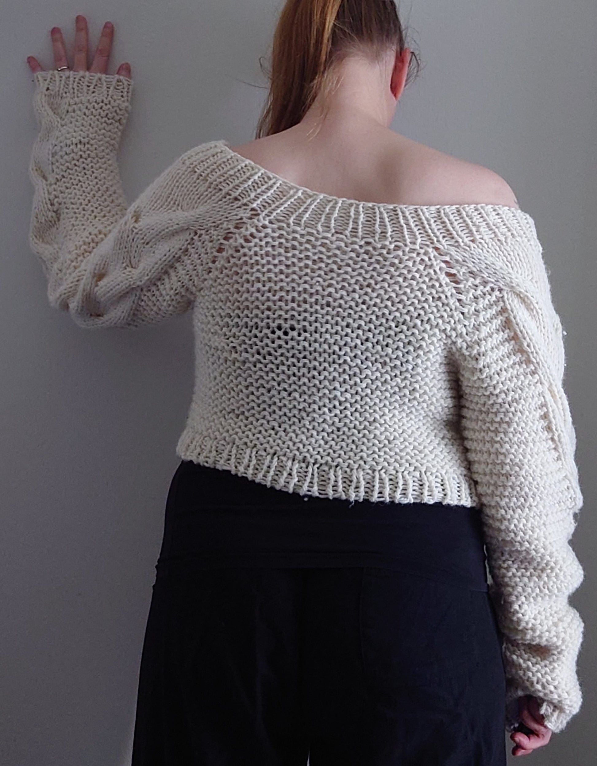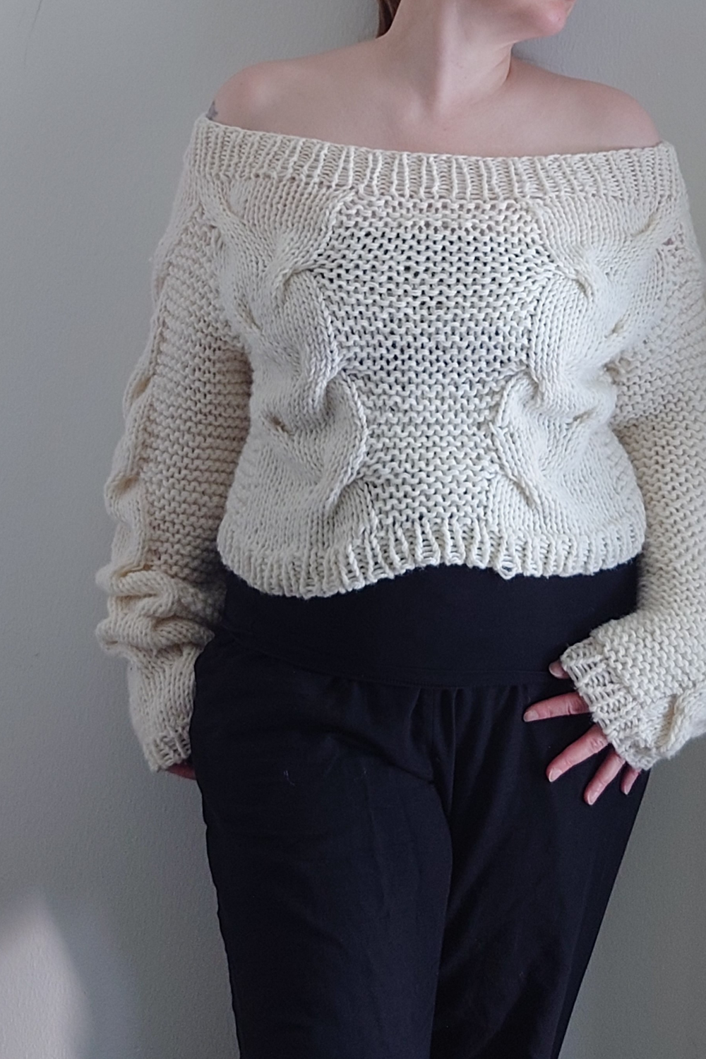 This cropped cold shoulder sweater is a masterpiece of cozy craftsmanship, blending Y2K fashion with timeless knitting appeal. The design features a relaxed, slightly cropped fit that accentuates the waist, with bold cold-shoulder cutouts that reveal just enough skin for a trendy, early-2000s vibe. Intricate cable-knit patterns twist across the chest and sleeves, adding texture and depth, while the chunky yarn ensures a plush, warm embrace. The oversized sleeves and soft, drapey fabric make it both fashionable and effortlessly chic, perfect for a modern knitter’s portfolio. Worked hem up, in the round, with raglan sleeves. No seaming!