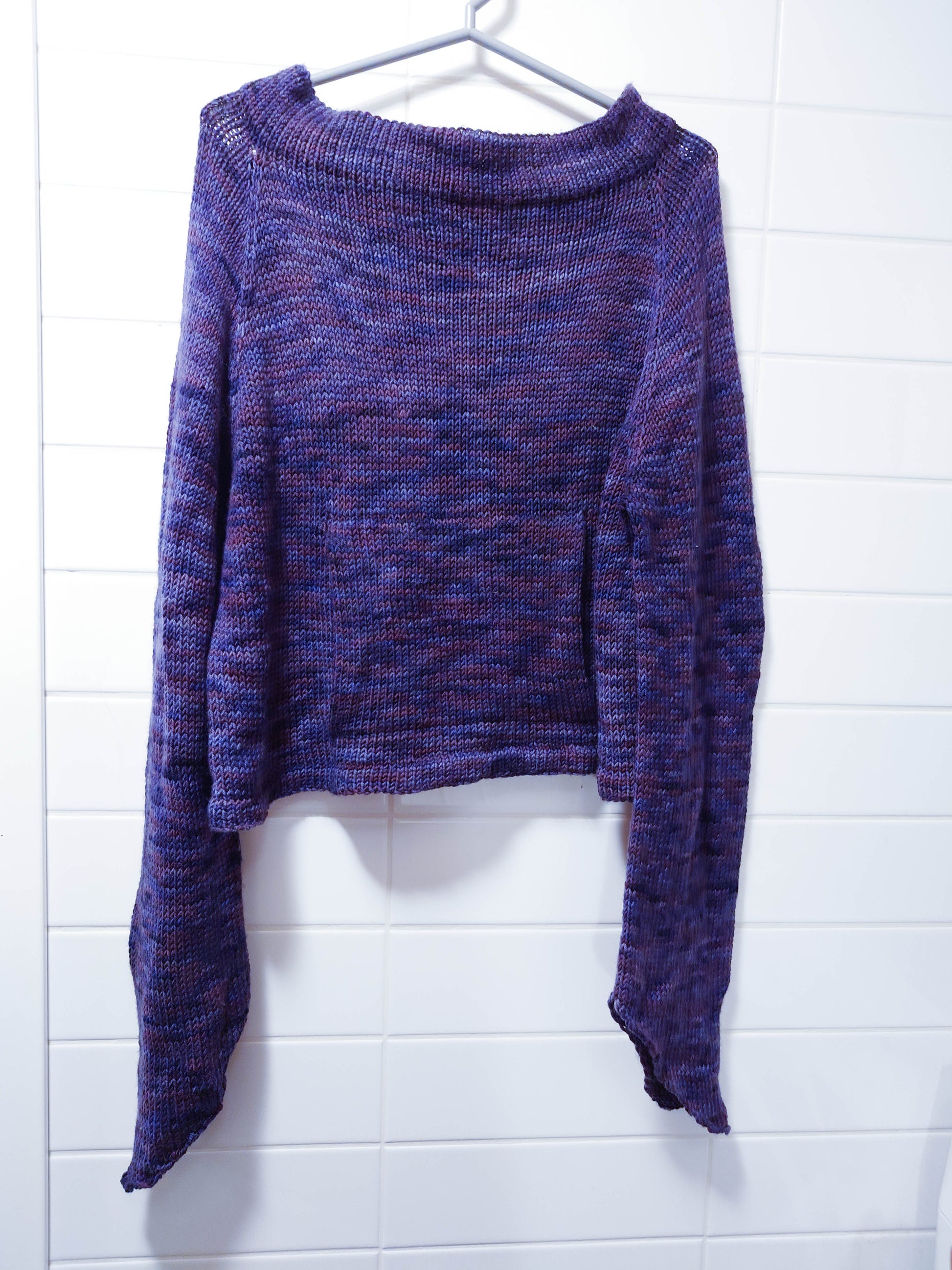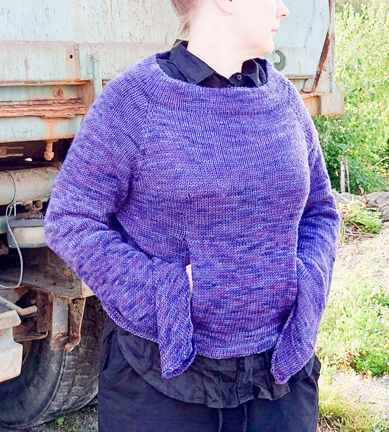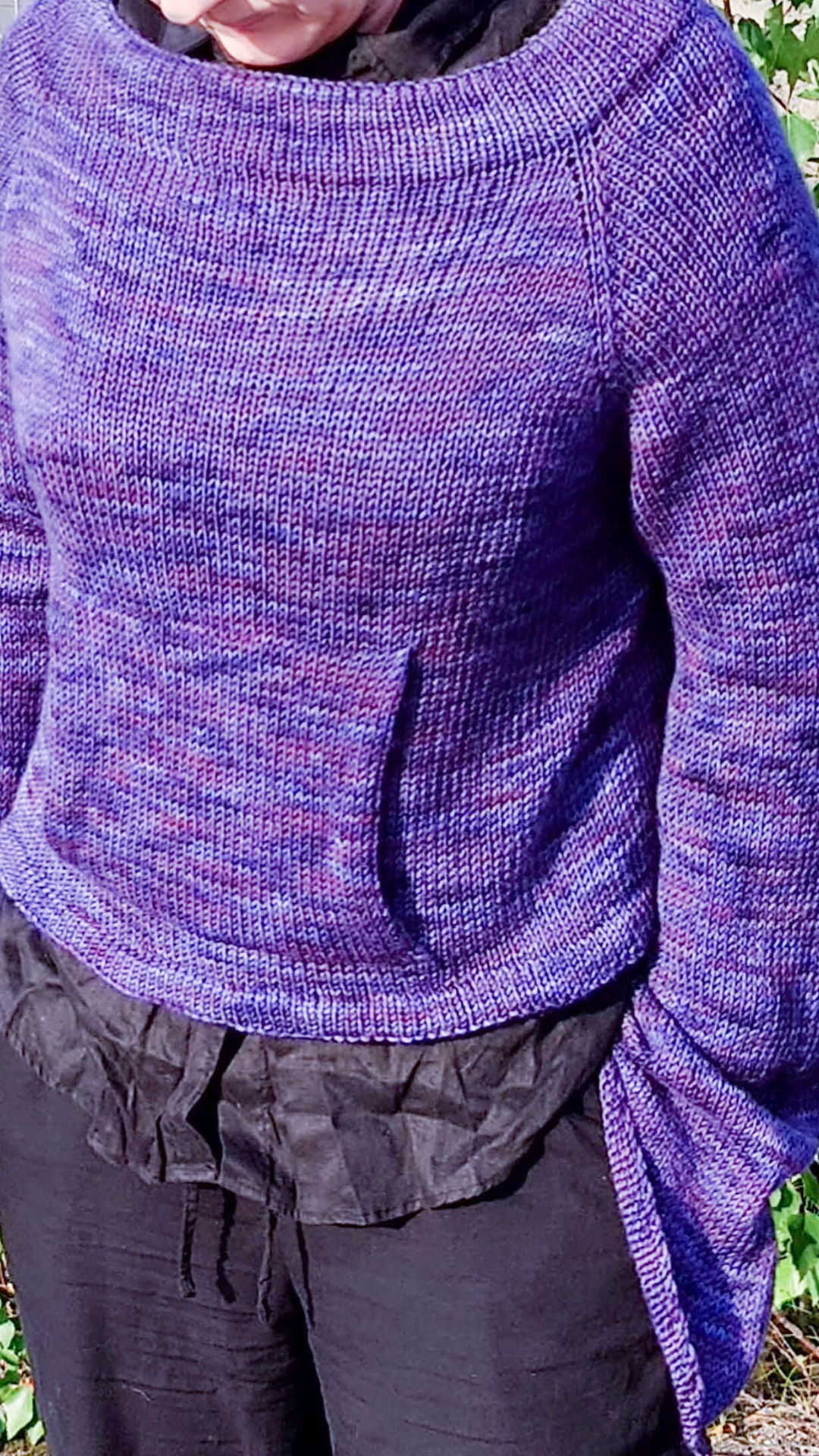 Knitting pattern for this pullover with boat neck, flared sleeves and big front pocket.