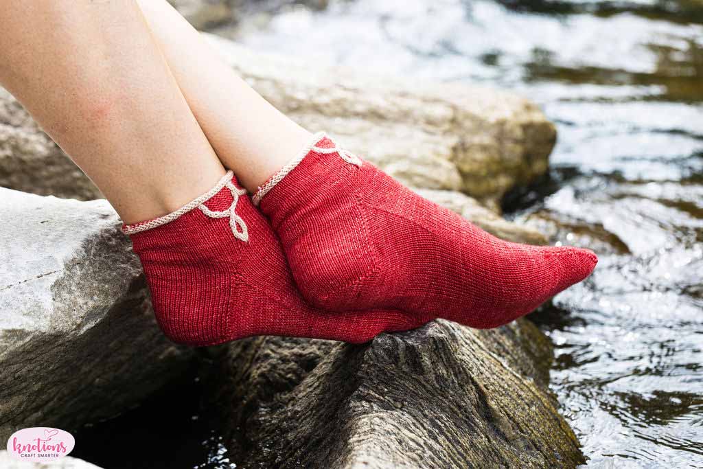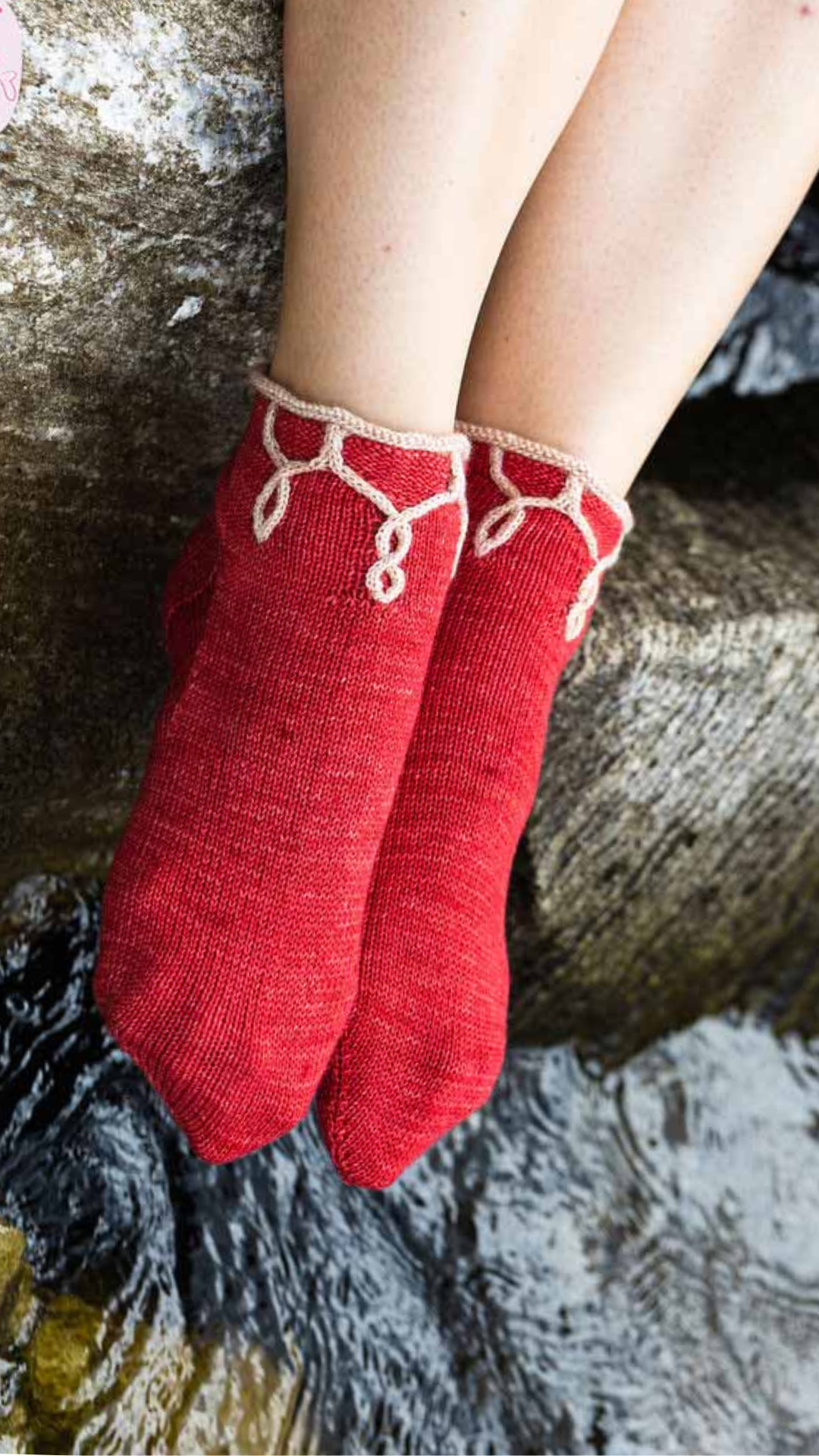 Cuff down crew socks knitting pattern with different colored intarsia cables. Yarn is light fingering.